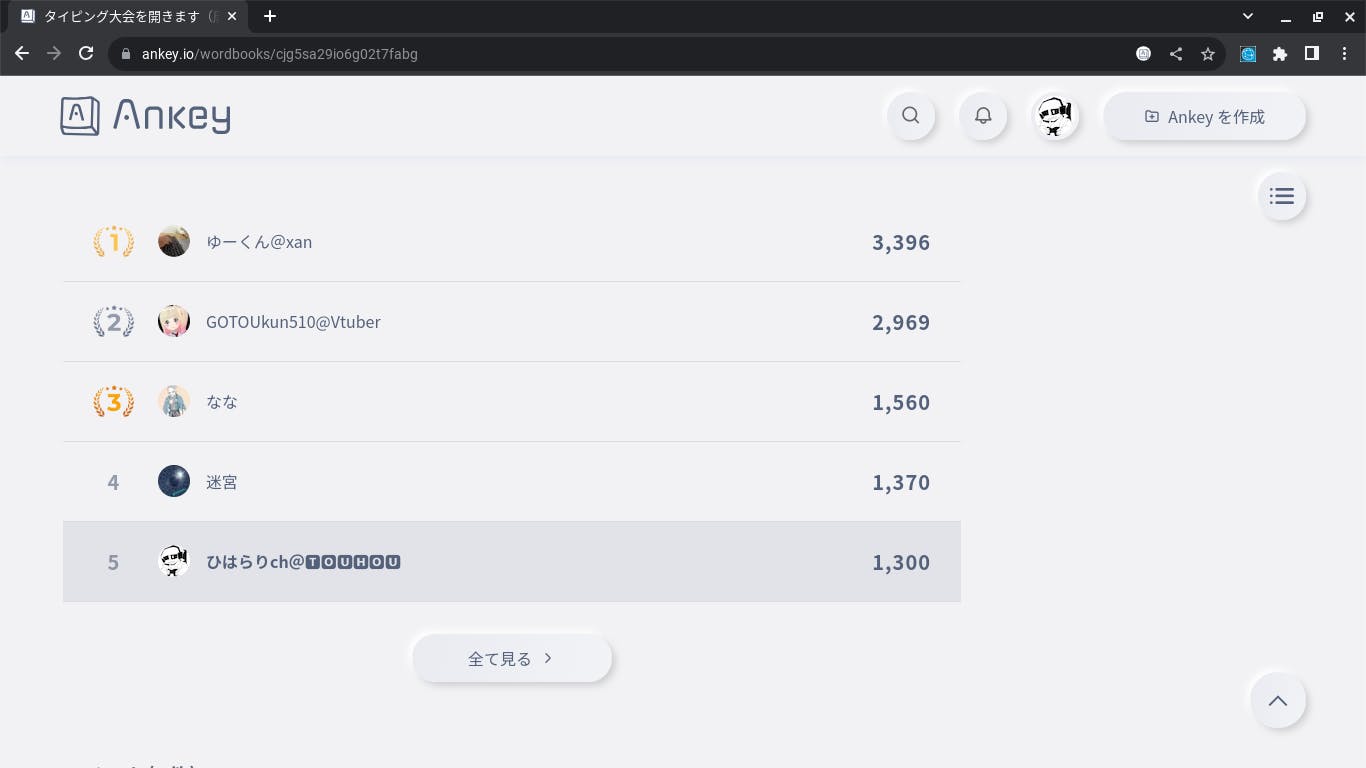 【結果】(9/3時点の集計です。すみません_(._.)_<本当は400回プレイは未達成) ・合計プレイ回数:408回 ・💖35 ・チャレンジ全制覇(隠しミッションを除く) ・大会の最高記録:2384スコア ・参加人数:32人 ・コメント数:240件(第一回よりUP!) 【ランキング】 一位…h-zhutianさん(四位→一位) 二位…jyojyomokoさん(ランキング変動なし) 三位…タイピング廃人さん(八位→三位) 四位…はかたの味噌さん(前例なし) 五位…ばくすぃさん(三位→五位)←宣伝Ankeyの件申し訳ありません_(._.)_ 頑張ったで賞…h-zhutianさん、jyojyomokoさん、ばくすぃさん(全大会に引き続きランキング上位だからです!おめでとうございます! ※賞品に「宣伝」が入っているものは、指定されたアカウントで言動しています。 本当に参加ありがとうございました_(._.)_ リンク…https://ankey.io/wordbooks/cj7nsg29io6g02r1tmv0