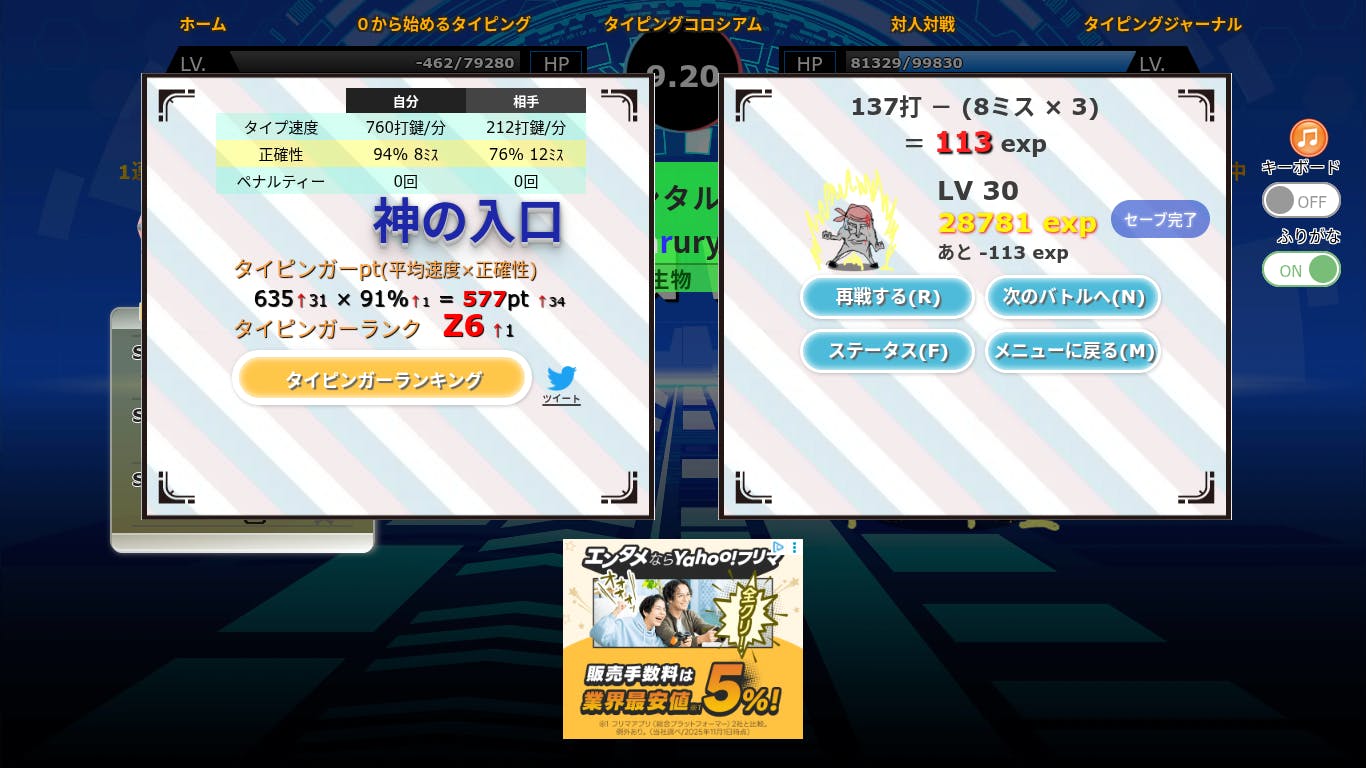 皆さんこんにちは。ハルトのankeyです。ということで、僕ですね。なんと760打鍵でました。うれしいです。まあ、そんなことはどうでもいいとして、今回の内容は、ちょっとぐちゃぐちゃな文章が登場します。 〜一言〜 なんか、最近ankey引退する人多くなったな..気のせいかな...?