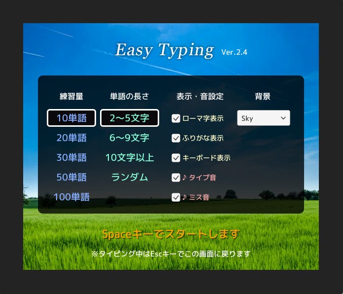 Neutral:Easyタイピング Ver.2.4【長文】(10文字以上) あの有名な、Easyタイピングです。 文章は追加する予定なので、もう少し、待ってください。 私のスコアはまたもやタイマーバグなので、気にしないでください。 100単語目標!だr((殴