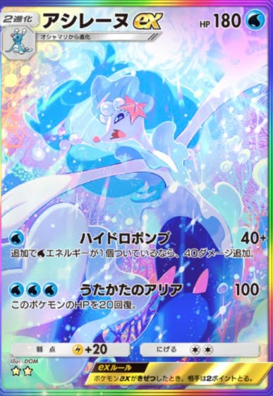 未知なる水域で初登場したカード。まず特性が強い。デッキの枚数が20枚しかない中でバトル場にいるだけでドローソースになるのがほんとに強い。あと技効果のお互いの場っていうのが良き。ニンフリザとかベンチに置きまくるデッキとかは相性抜群。タマンタとか優秀サポートいるし水タイプの覇権復活か?