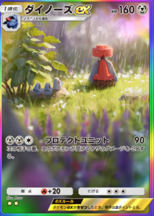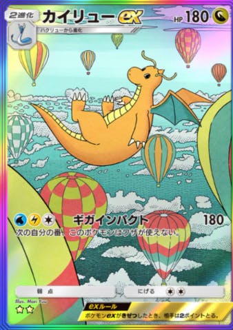 イーブイガーデンで初登場したカード。水・雷・無の二色のエネ。打点は180で、次のターン技が打てない。でも一回ベンチに戻れば解除だから、カイリューを二体作って逃げて逃げて、、、一匹UBを用意してテッカグヤ詐欺とかイリマ使ったりとか色々やり方はある。あと空と海の導きでホウオウが炎・水・雷の三種エネを追加できるから今後に期待って所もある。