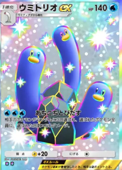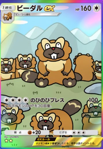 空と海の導きで初登場したカード。タイプ、HP、打点、エネ、、、何という何をダダリンexに上回っているカード。超スーパーミラクルウルトラ完全上位互換。二エネ90打点は結構あるし、1ターン目に技打って2ターン目にエースに交代して逃げられなくなったやつをパン!と粉砕して勝利って流れになると思う。まぁ強いんじゃね?