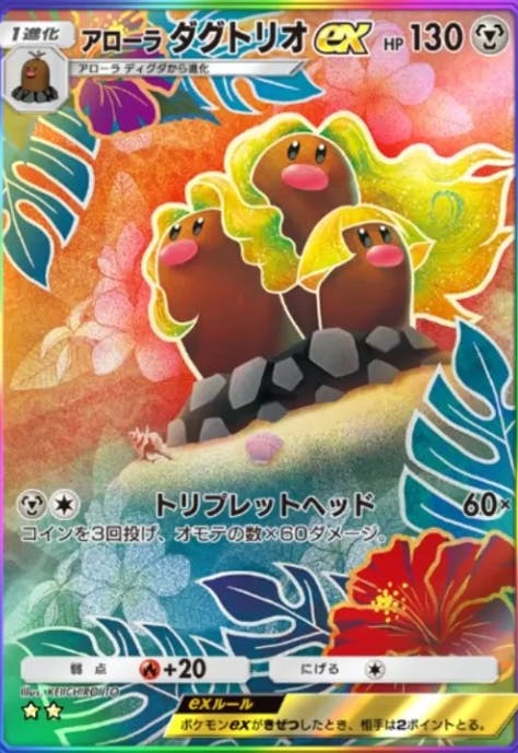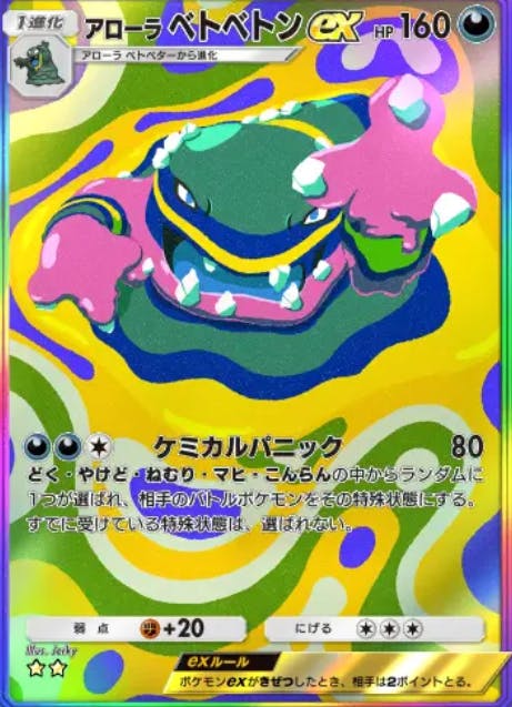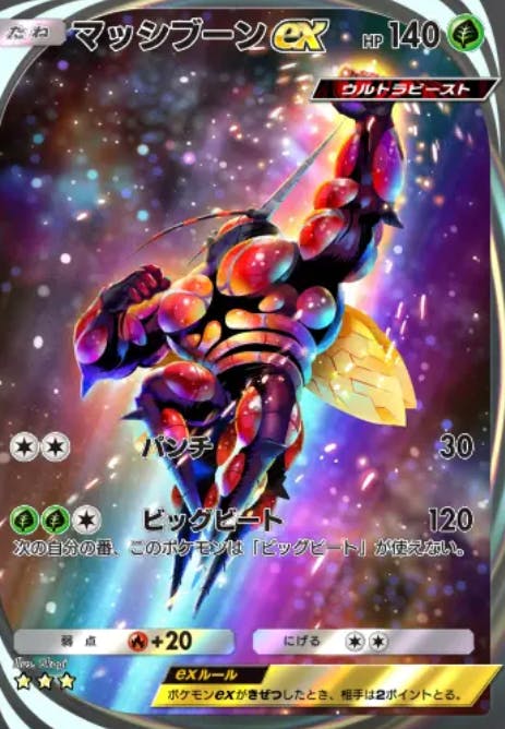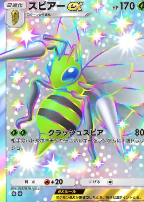 双天の守護者で初登場したカード。最弱exとも呼ばれる。弱ポイント①HPの低さ リーフマントつけても新リザでワンパン②エネ数の多さ 意外と関わってくる ③威力 しょぼい ④性能 テッカグヤで交代できる そこらへんかな
