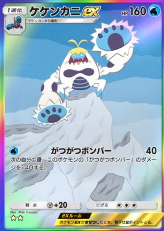 双天の守護者で初登場したカード。先行最速ケケンカニで1エネ80ダメージ連打して手札事故起こったときは種ポケをワンパンしていく。強い。でも中盤は火力の少なさから耐えて粉々になる流れ。あとはバトンタッチって感じ
