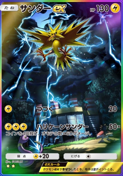 最強の遺伝子で初登場したカード。2エネためて0ダメージの恐怖。だったら3エネためてサンダー使ったほうが良い。もしこれが元から80でコインで+80だったら強かったかも。