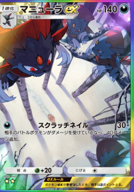 時空の激闘で初登場したカード。キャラパワーは低いけどダークライexとの相性が良すぎた。スクラッチネイルが1エネで済むからその分ダークライにエネを回せるし、特性で20ダメージでスクラッチネイルで70ダメージで90打点。それを連発できるんだよ?強くないわけ無いじゃん。
