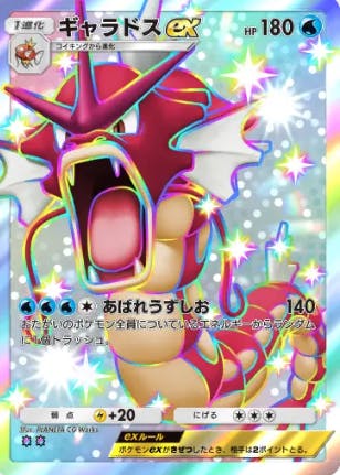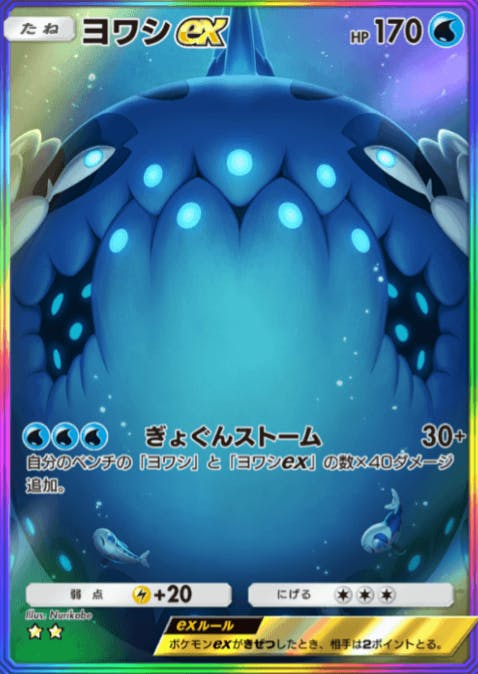 双天の守護者で初登場したカード。HP170と多く、カイやカスミなど使えるサポートも多いが、技の性能が微妙い。最大30+40×3=150とマントなしワンパンラインは超えるけど、ノーマルヨワシのHPが30だから、最強の遺伝子のサワムラーさんでもワンパンされちゃう。ナツメにも弱いし、 1匹倒されただけで火力が120と最近のexはほとんど耐えられてしまう。そこがダメ