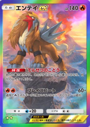未知なる水域で初登場したカード。まず特性が強い。デッキの枚数が20枚しかない中でバトル場にいるだけでドローソースになるのがほんとに強い。そしてこのポケモンの最大の強さは速攻も最後も火力出せるってとこ。ブビィ使って先行2ターン目から60ダメージをたねポケに押し付けられる。んで、その2ターン後には4エネついて120ダメ。ブビィとエンテイのみのデッキとかも強そう。