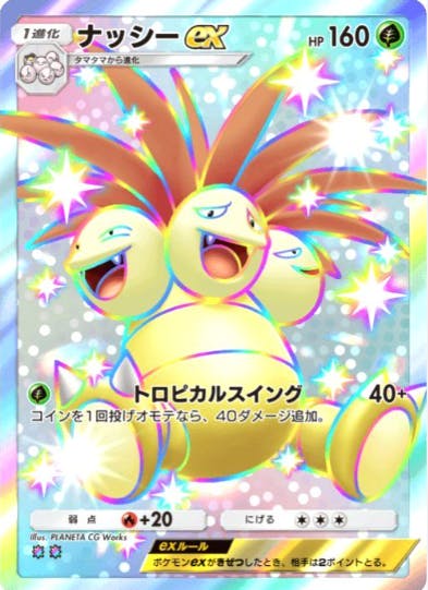 空と海の導きで初登場したカード。ナッシーexの上位互換にも下位互換にもなるカード。HPは実質140。リーフマントで170。でもガオガエンやら新リザやら強い炎exが多いからワンパンされやすい。だからやっぱりナッシーexみたいな使い方かな。